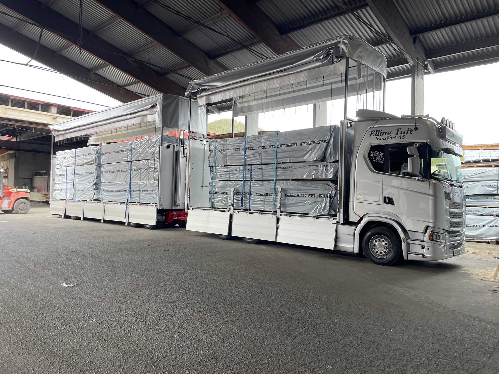 Våre materialbiler er spesialbygd for transport av trelast og byggevarer, med kapasitet på opptil 80 m³ per lass. Transportene utføres over hele sørlige Norge, samt noe til Europa, og er godt egnet for både prosjekt- og volumleveranser.